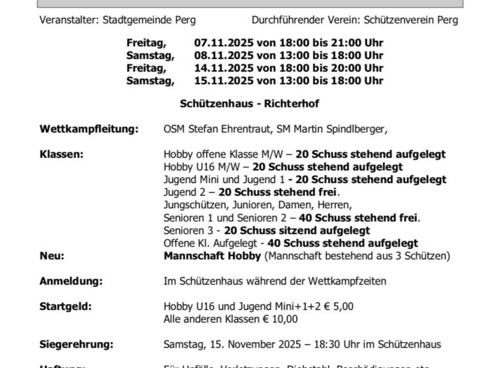 Herzliche Einladung an alle Pergerinnen und Perger uns bei der Stadtmeisterschaft zu besuchen! Auch eine Mannschaftswertung ist heuer neu – wir freuen uns auf euren…